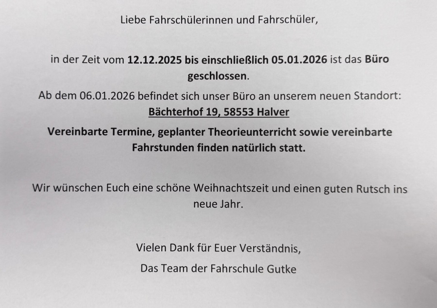 Sollte Euch dies nicht möglich sein, vereinbart bitte einen Termin über info@fahrschule-gutke.de.